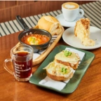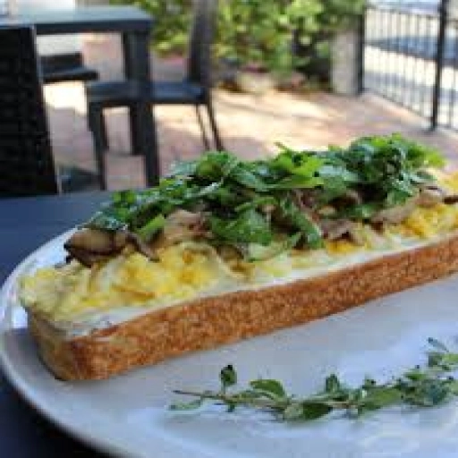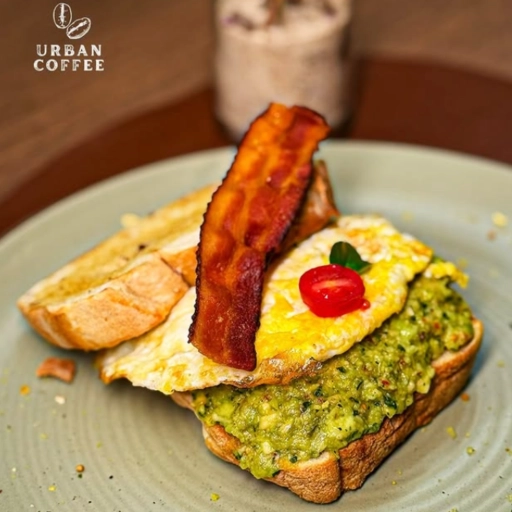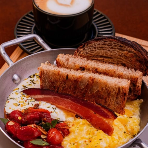 Fatia de pão rústico + ovos cremosos + bacon + tomate confit + creme de ricota + capuccino italiano