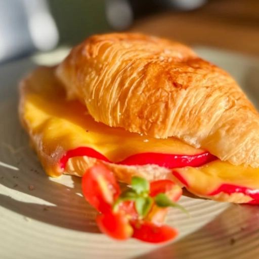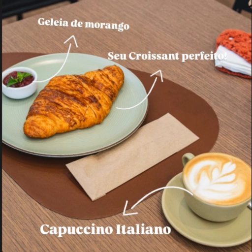 Croissant amanteigado + geleia artesanal de morango ou requeijão + capuccino italiano