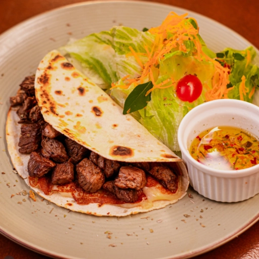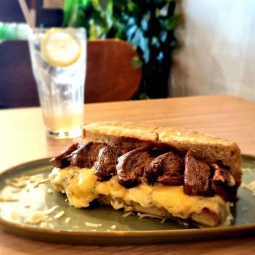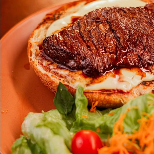 pão ciabatta, cubos de mignon grelhados, maionese defumada e queijo do reino ao forno)