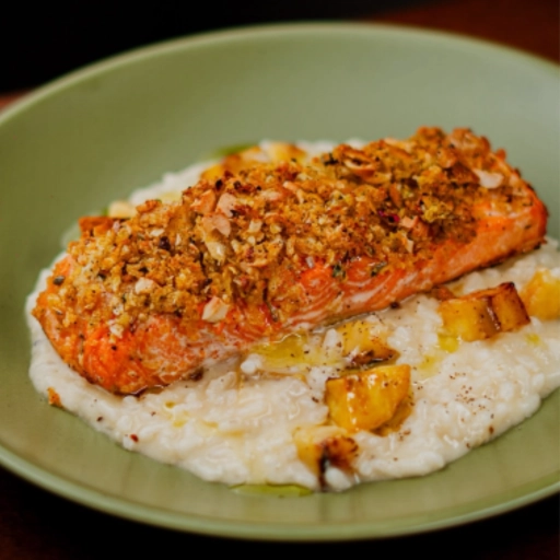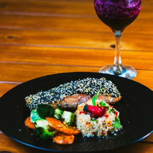 camarões grelhados + lâminas de abobrinha + crème de limão siciliano + lâminas de amêndoas tostadas