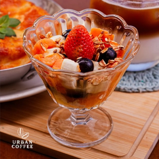 Fatia de pão multigrãos + ovos cremosos com rúcula + iogurte com frutas + espresso duplo
