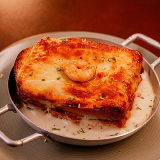 pão brioche + camarões grelhados + molho bechamel + mussarela gratinada